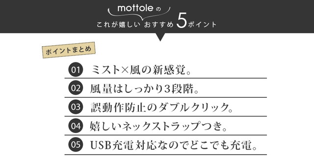 セット内容 本体(リチウムイオン電池内蔵)、USBコード、ネックストラップ、給水ボトル、説明書 素材 本体:ABS、羽根:PP、ネックストラップ:ポリエステル、給水ボトル:PET・PP サイズ / 重量(約) 幅:104×奥行:66×高さ207(mm)/180g 羽根径(約) 3.4 inch (約8.5cm) 充電電池 リチウムイオン電池 3.7V 1200mAh 電源コード(約) USBコード :750mm 風量調節 3段階(弱・中・強) 加湿能力(約) 15ml/10min 充電時間(約) 4.5時間 タンク容量(約) 15ml 連続使用可能時間(約) 3時間(弱)〜1.5時間(強)