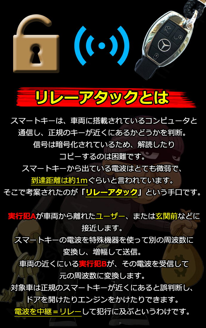 【リレーアタックの手口は以下の通りです】 1.泥棒Aが運転手に近づく 2.特殊道具で運転手の持つスマートキーから出る微弱電波を受信 3.道具で受信した電波を増幅して別の泥棒Bが持つ道具に送信 4. 泥棒Bが増幅したリレー電波を発生させながら車に近づく 5.泥棒B車に触れて鍵の解除をする 6.泥棒Bが車に乗り込みエンジンをかけ逃走 盗難された車は、そのまま海外に売られるか、 国内でバラバラに解体され各部品として海外に輸出されます。